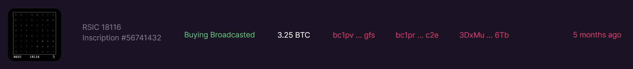 空投立即取得了成功。2024年2月,一个稀有的RSIC以3.25 BTC的价格售出。到2024年3月,RSIC元协议的底价峰值达到了约0.115 BTC。自推出以来,该系列的二级交易量已超过1600 BTC,使其成为序数生态系统中最受欢迎的收藏之一。